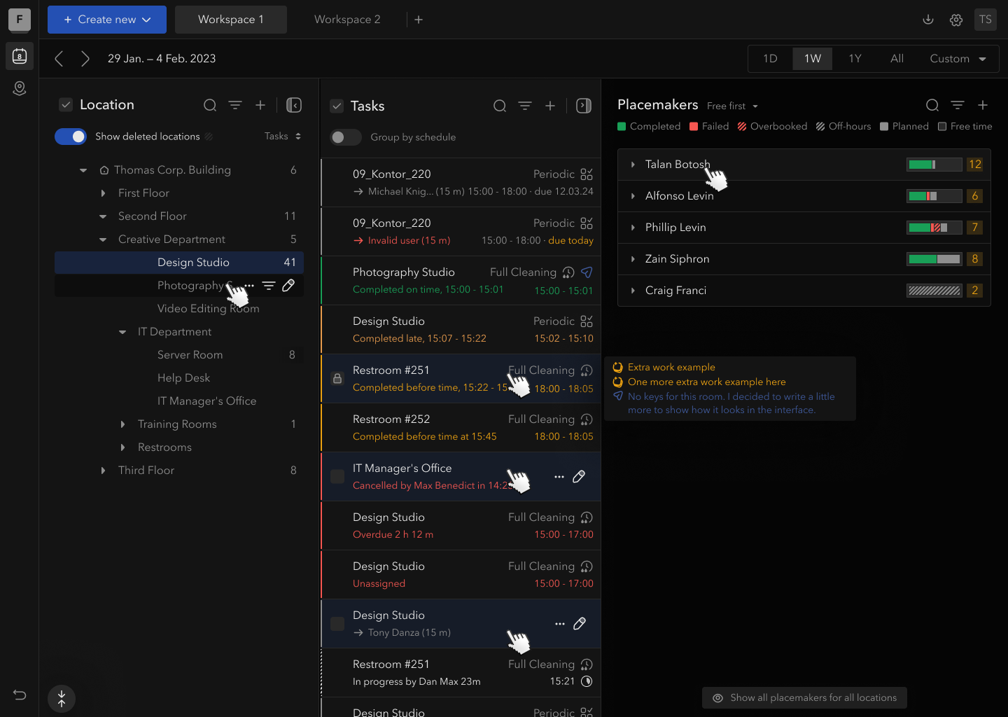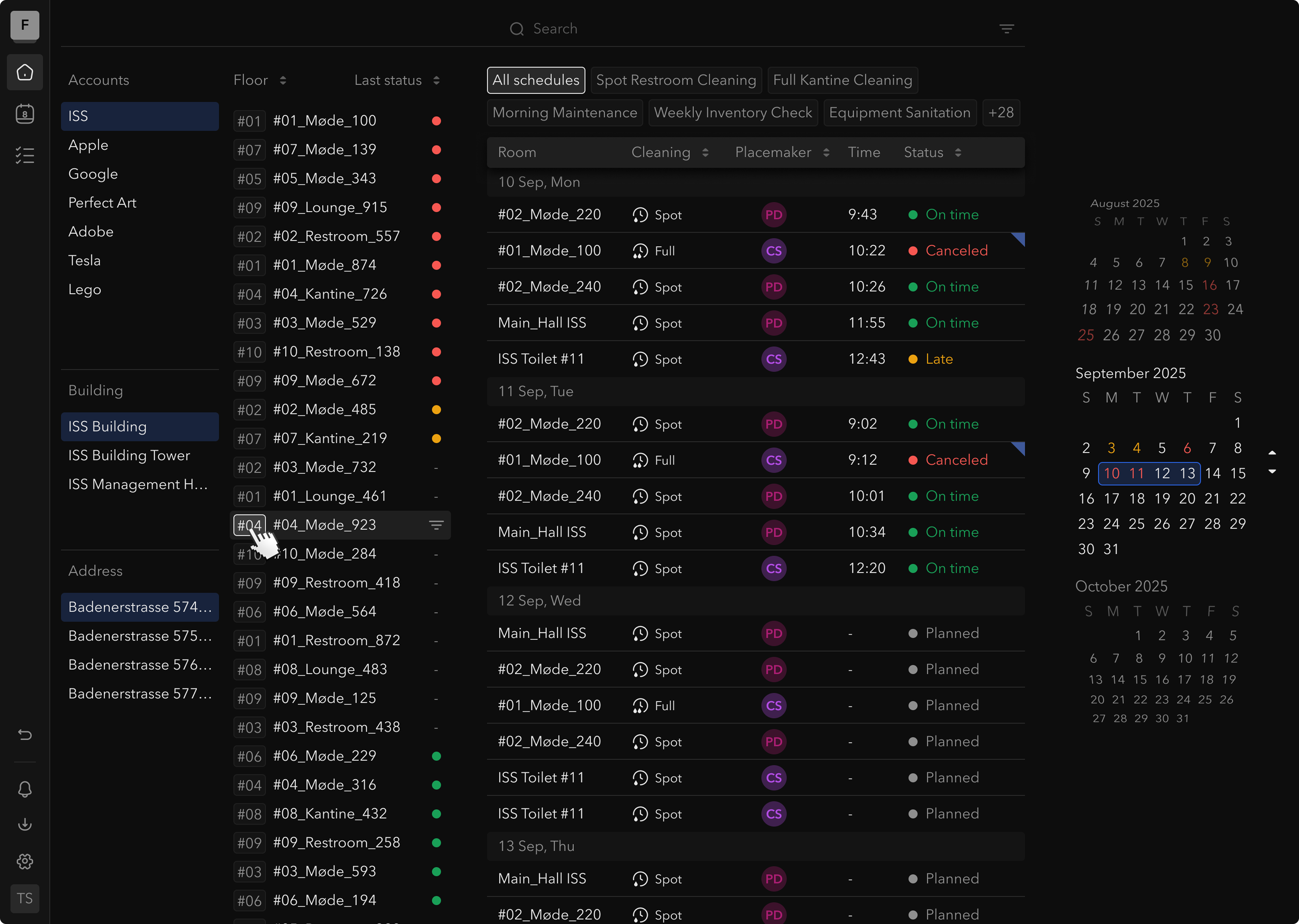 When I started the dashboard redesign, the situation was this: to see the cleaning status for a specific room, a manager needed to navigate five levels deep — Company → Region → Building → Floor → Room. The timeline showed one fixed week with no flexibility. Critical failures and completed tasks looked the same. There was a global search, but results came back unfiltered across the entire hierarchy.